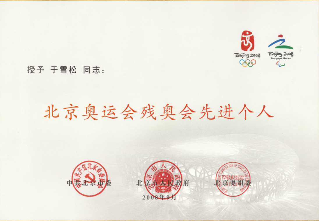 2008北京奧運會、殘奧會先進個人榮譽證書-于雪松