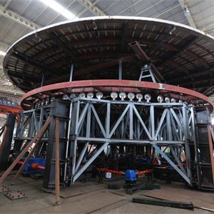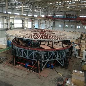 舞臺(tái)升降機(jī)是節(jié)目(秀)的一個(gè)重要布景元素,為單層結(jié)構(gòu),行程: -5.60m至 -3.60m,總行程為2.0m。舞臺(tái)升降機(jī)的頂面將沿著單一軸線從水平位置傾斜10度。整個(gè)頂面可以連續(xù)旋轉(zhuǎn)。升降機(jī)可提供持續(xù)的電源,升降機(jī)下方配備工作照明。所有配電線路在升降機(jī)框架內(nèi)的導(dǎo)管中運(yùn)行。升降機(jī)的頂面為防漏不銹鋼底盤(pán)。底盤(pán)向中心填充點(diǎn)傾斜 10mm/m;外加8mm的地板表面材料,結(jié)合至 25mm PVC 板材。底盤(pán)外緣是一個(gè)連續(xù)的環(huán)形溢流排水口。圍繞舞臺(tái)升降機(jī)是一個(gè)環(huán)形無(wú)邊水效果。在周邊平臺(tái)盤(pán)中有非吸水性地板材料,坡度也是 12mm/m,與舞臺(tái)升降機(jī)相配。