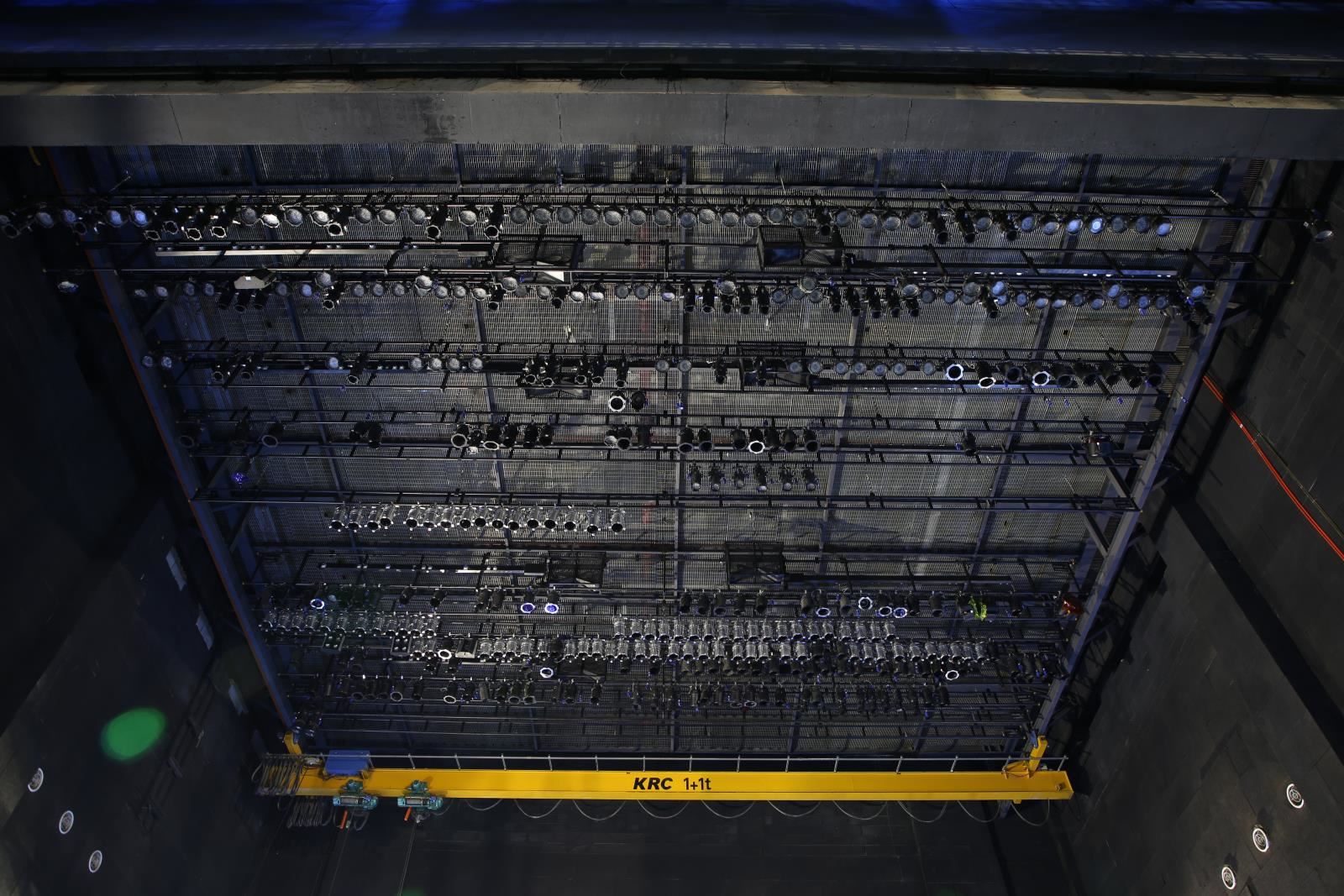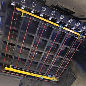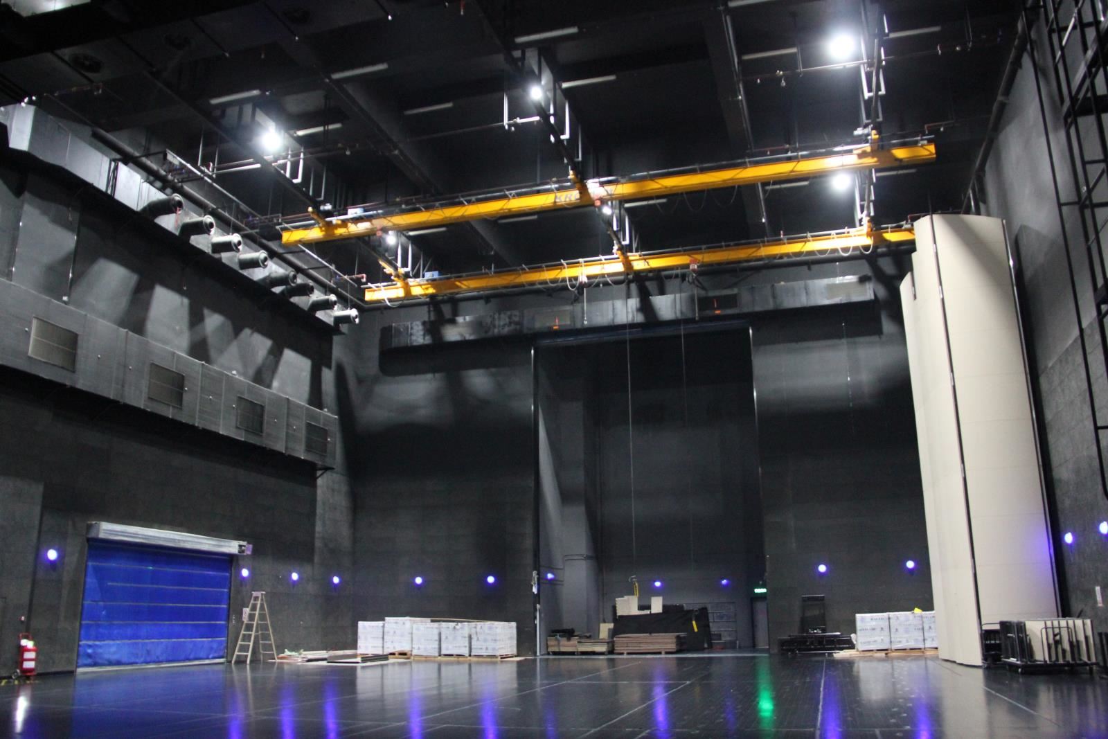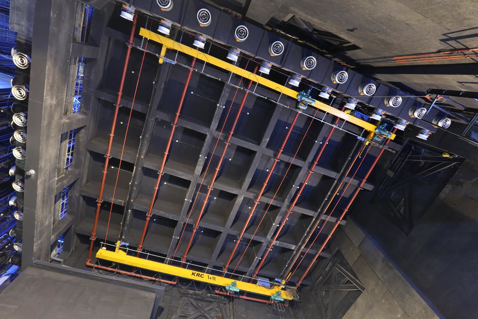 側(cè)臺(tái)裝景行車位于左右兩側(cè)側(cè)舞臺(tái)上空。行車用于大型或重型布景部件的裝配。