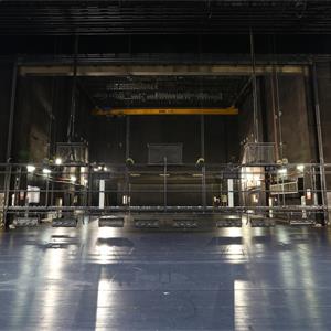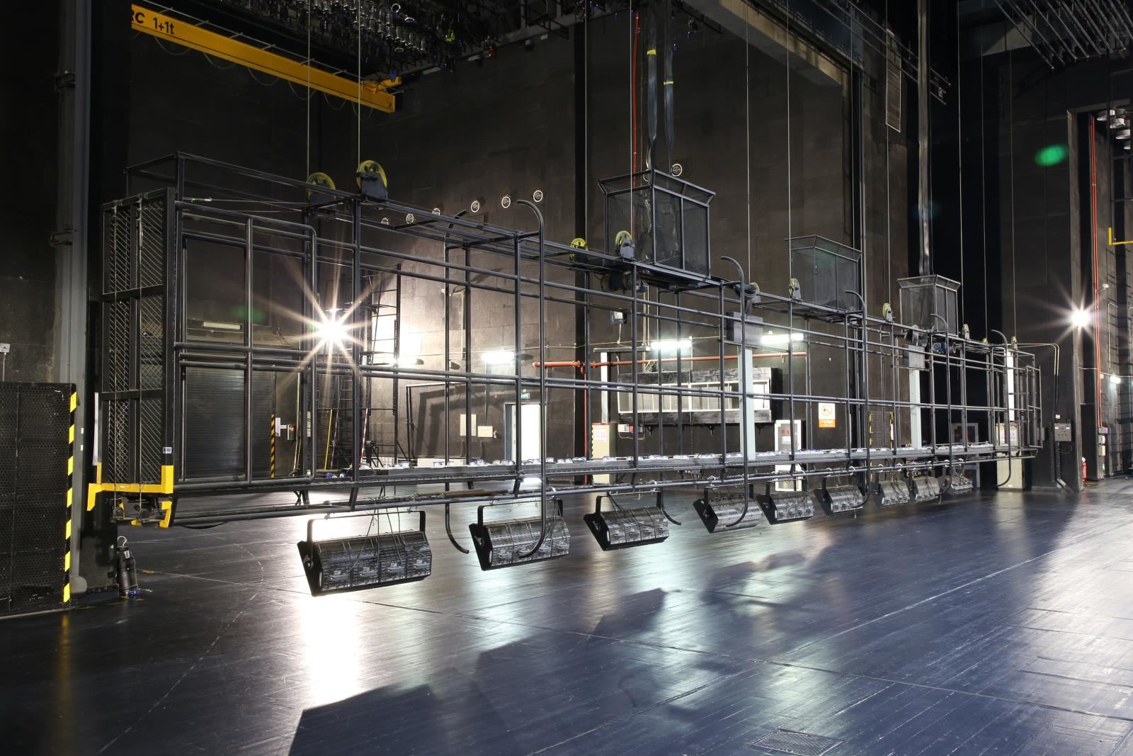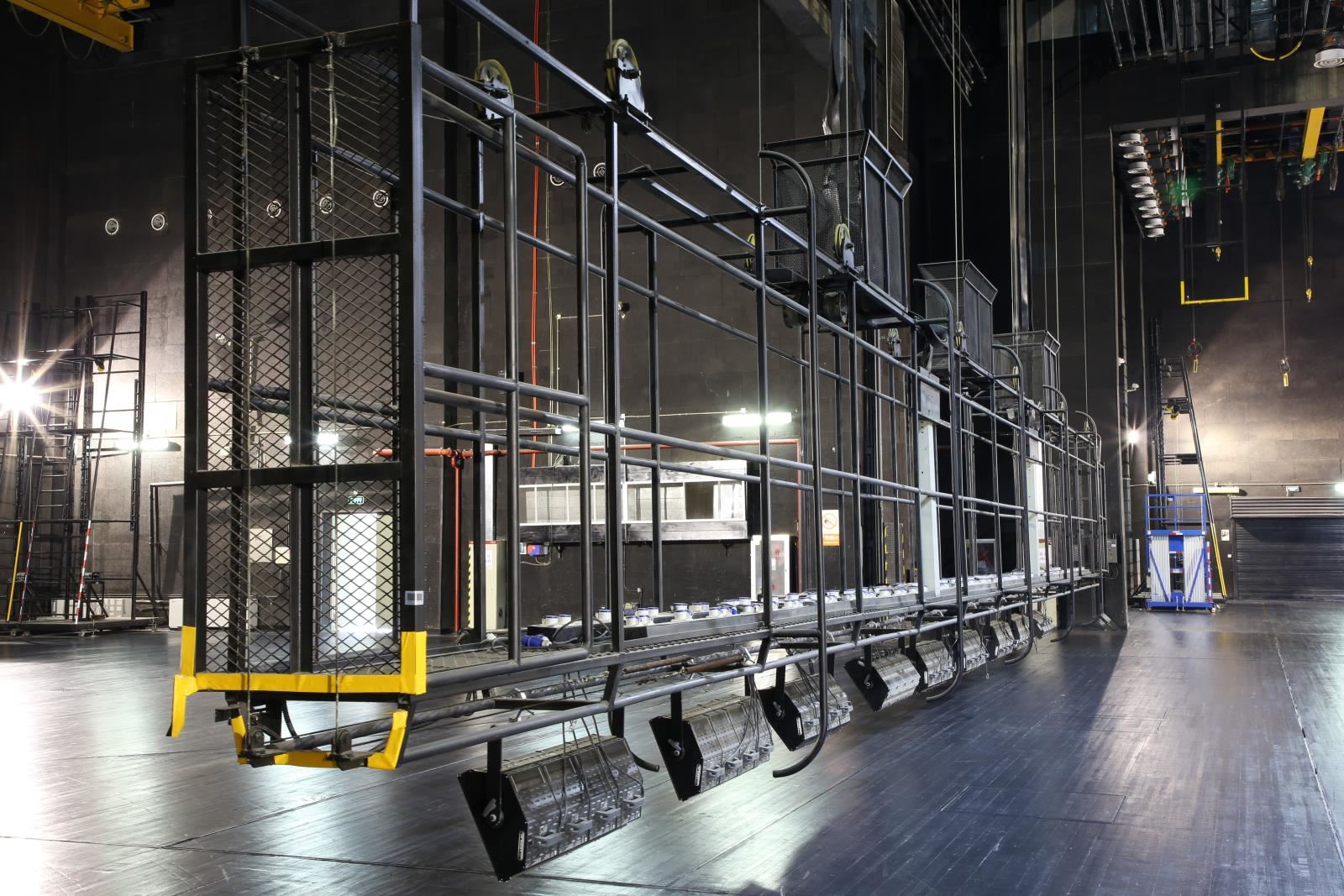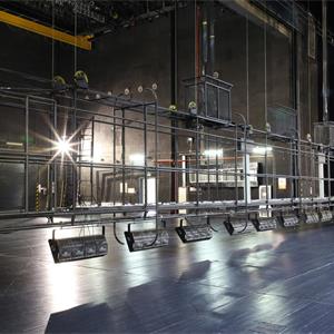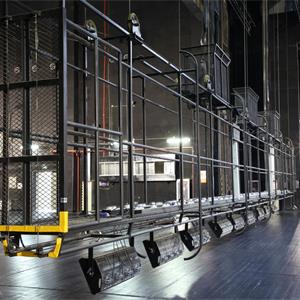 設(shè)置于主舞臺上空,用于吊掛舞臺燈具?,F(xiàn)在一般較少設(shè)燈光渡橋,如設(shè),較常設(shè)在主舞臺后區(qū)(即天幕景區(qū))上空。燈光渡橋與一層天橋通過“碼頭”相連,許可2名工作人員進(jìn)入燈光渡橋工作。碼頭形式一般為翻轉(zhuǎn)式,翻轉(zhuǎn)到位后固定于天橋上。燈光渡橋的兩側(cè)設(shè)計便于安裝燈具,設(shè)電纜收納裝置。一層天橋兩側(cè)與“碼頭”對應(yīng)位置各設(shè)一道安全防護(hù)門。天幕燈光渡橋上一般鋪設(shè)5mm厚的鋼板網(wǎng)(QB/T3896-1999)TL=22mm,TB=26mm,鋼板網(wǎng)上鋪設(shè)橡膠地板,型號為天然耐磨膠板,厚度為4mm。