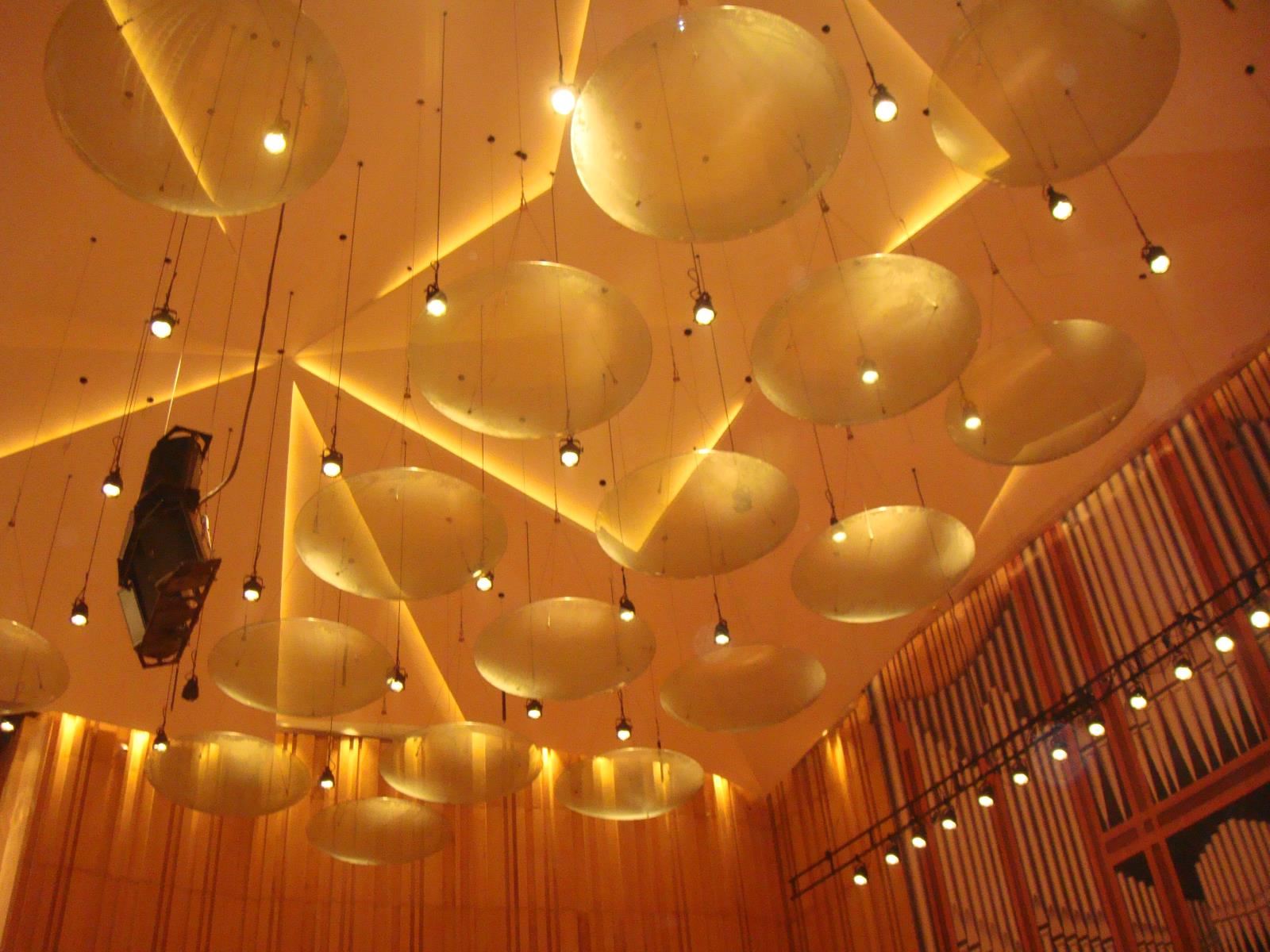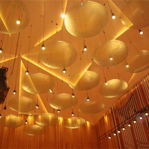 反聲板一般布置于音樂(lè)廳演奏臺(tái)/區(qū)上方。反聲板的面積、塊數(shù)、形狀根據(jù)廳堂聲學(xué)設(shè)計(jì)而定。一般分為整塊式和分塊式兩種。反聲板剖面形狀一般選擇為弧形下凸?fàn)?。反聲板根?jù)需要可調(diào)整高度與角度(一般是調(diào)整建筑縱剖面上的角度,即一般反聲板具前后角度俯仰功能);音樂(lè)廳用反聲板以透明材質(zhì)為主。