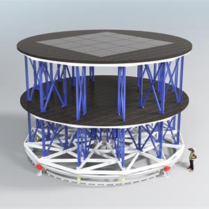 鼓筒轉(zhuǎn)臺(tái)設(shè)置于主舞臺(tái)靠近臺(tái)口一側(cè),為戲劇專用舞臺(tái)最重要的舞臺(tái)機(jī)械之一,鼓筒直徑Ф14~18m,通過臺(tái)體旋轉(zhuǎn)來滿足戲劇演出及遷換布景的需要。鼓筒式轉(zhuǎn)臺(tái)為雙層結(jié)構(gòu),采用回轉(zhuǎn)支撐方式。轉(zhuǎn)臺(tái)臺(tái)面上裝有升降臺(tái)或拼裝臺(tái)面。用于演出中轉(zhuǎn)化布景,以達(dá)到不同的舞臺(tái)布景效果。高配置型號(hào)升降臺(tái)可帶傾斜臺(tái)面。