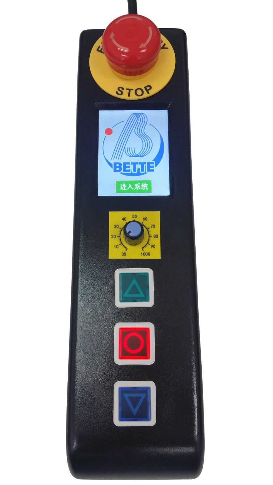 近控盒上裝有“緊急停止按鈕”,與主控制系統(tǒng)的急停鏈做串聯(lián)處理,在遇有無法正常停車的情況時(shí),可以拍下此按鈕,切斷主控制系統(tǒng)的三相供電,待排除了意外情況之后再予以恢復(fù)。